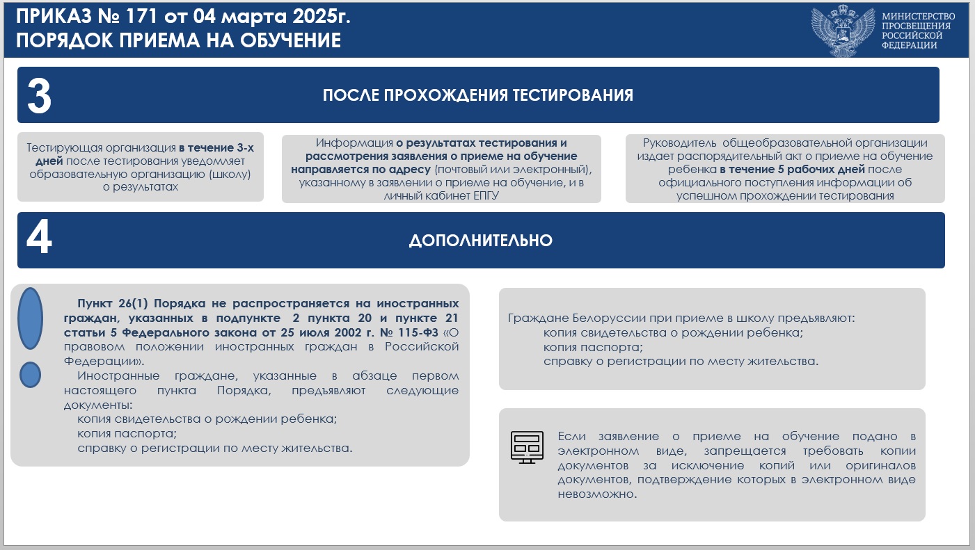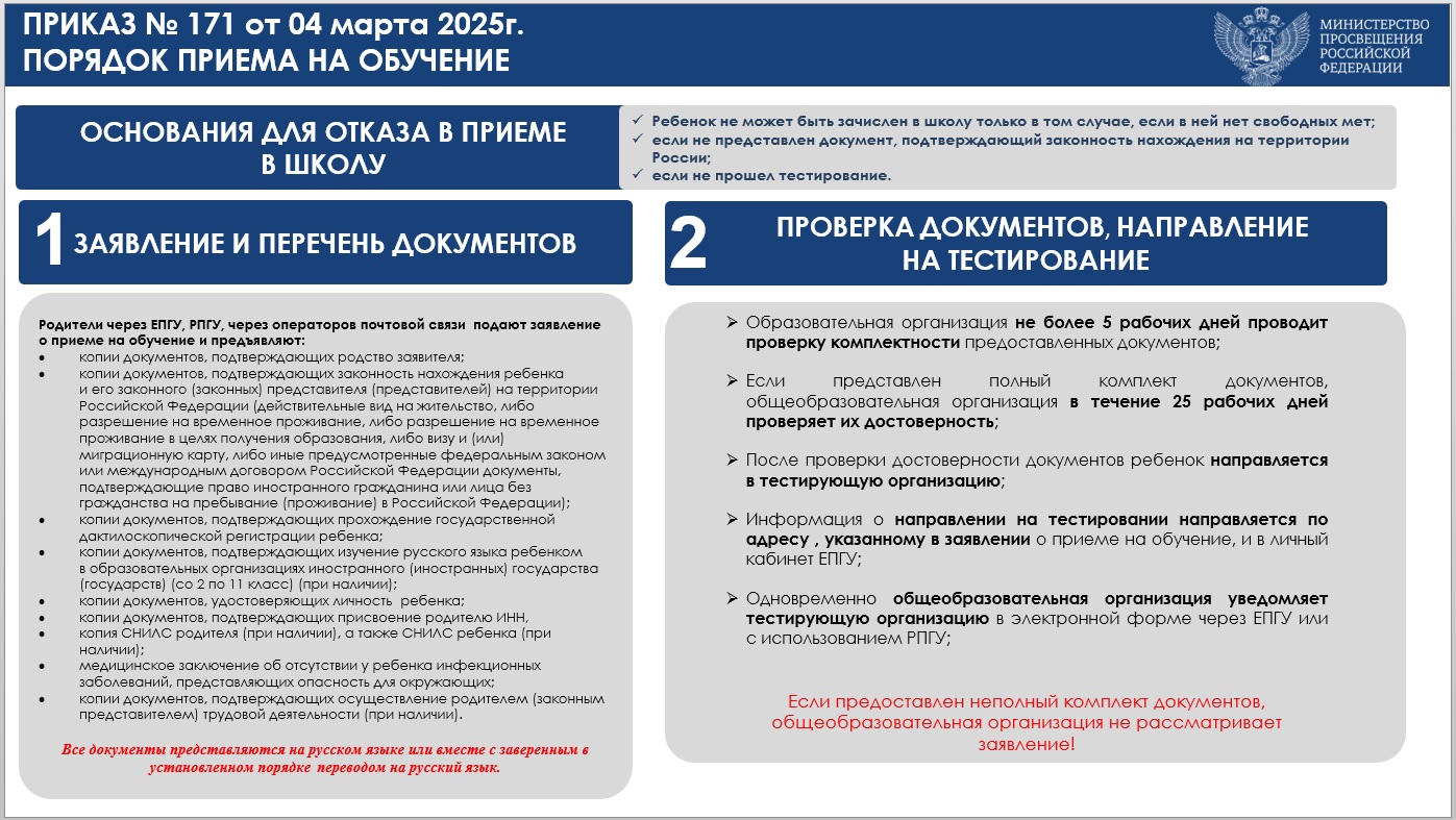 Приказ Минпросвещения России от 04.03.2025 № 171 "О внесении изменений в Порядок приема на обучение по образовательным программам начального общего, основного общего и среднего общего образования, утвержденный приказом Министерства просвещения Российской Федерации от 2 сентября 2020 г. № 458"